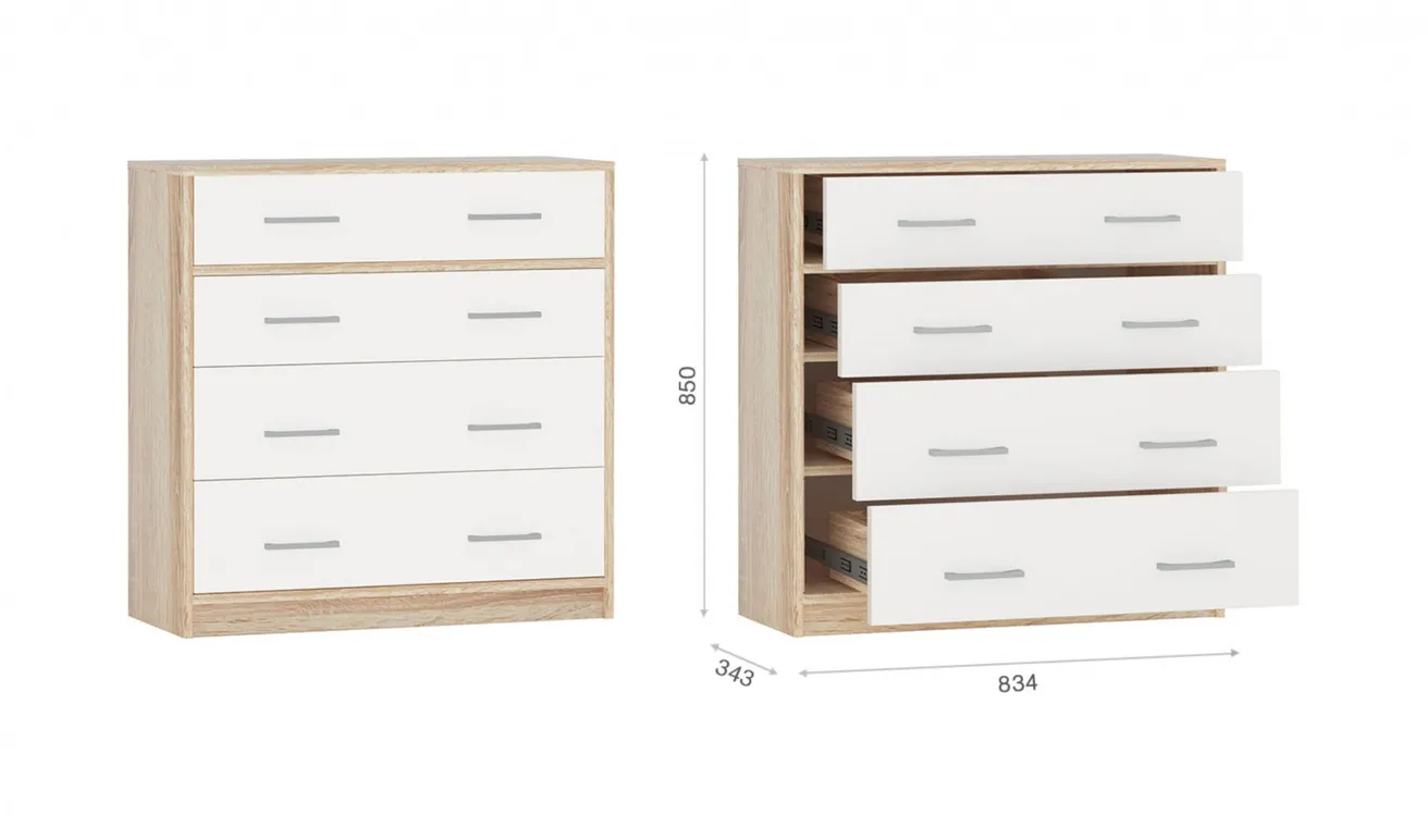 Функциональное дополнение интерьера. Наличие выдвижных ящиков с телескопическими направляющими полного выдвижения - вещи, лежащие в дальнем углу, становятся легкодоступными. Верхнюю крышку можно использовать для декора или фотографий. Легко превращается в туалетный столик, достаточно повесить над ним зеркало.