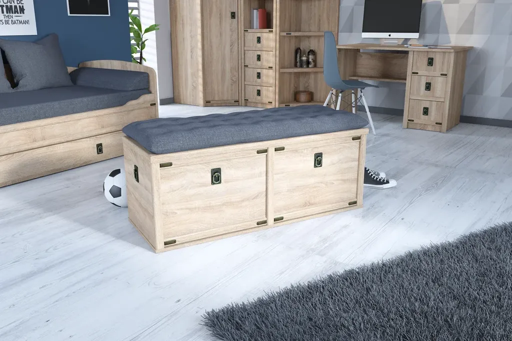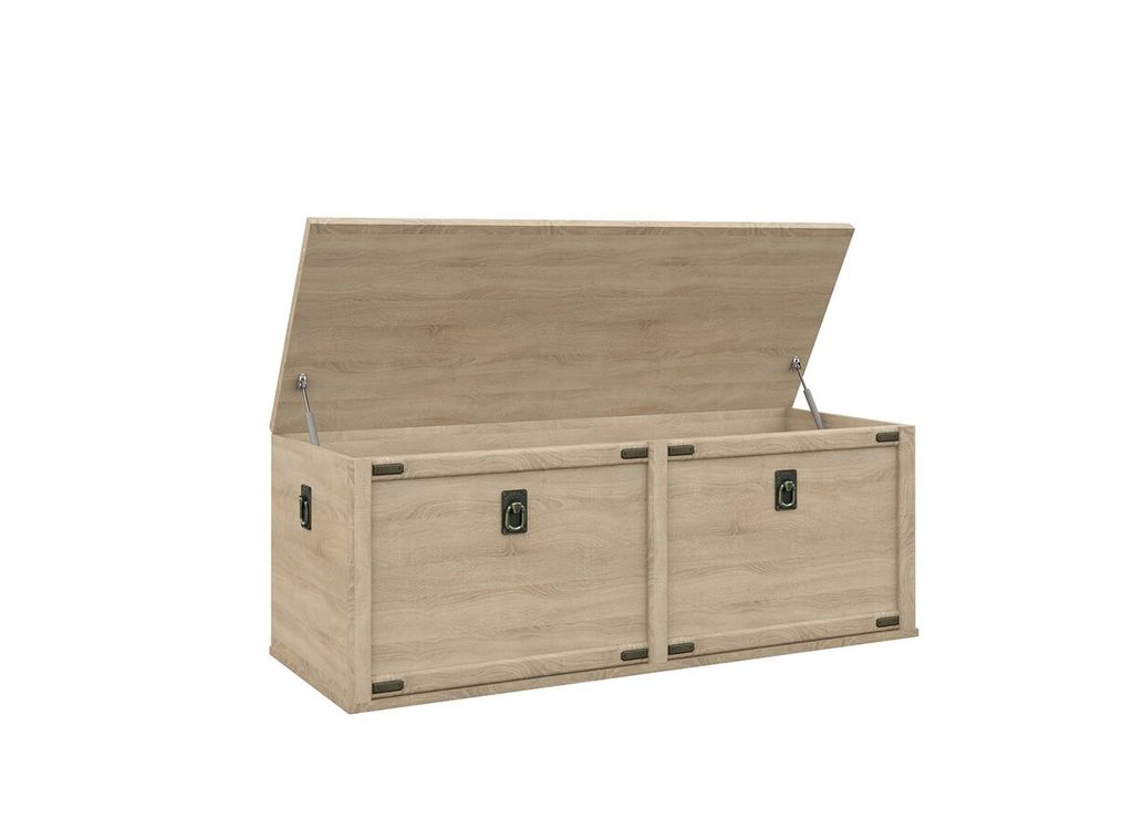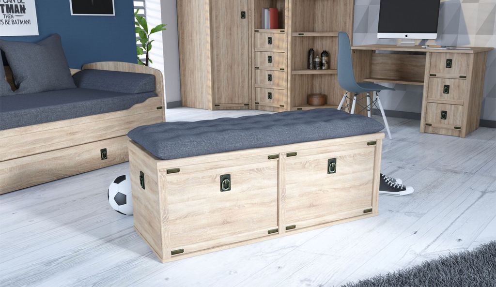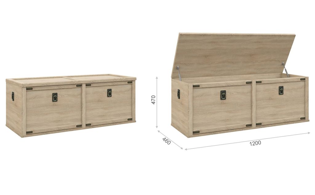 Сундук - Украшением служат стилизованные металлические ручки MARINE бронзового цвета и декоративные элементы в тон. Декоративные накладки и профиль из МДФ по периметру придают модулю более эффектный и надежной вид. Вместительный ящик глубиной 47 см позволит быстро навести порядок. Крышка открывается за ручки и надежно фиксируется в открытом положении, благодаря газлифту. Мягкую подушку и превратить сундук в мини-диван с двумя посадочными местами.