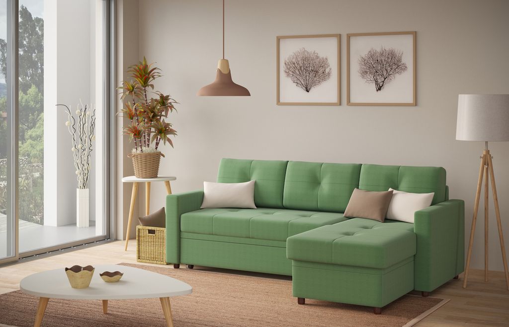 Максимально использовать площадь небольшой гостиной поможет современный угловой диван-кровать «Лира 1». Его основным преимуществом является наличие универсального угла, местоположение которого можно выбрать во время сборки. В оттоманке удобный ящик для хранения вещей или спальных принадлежностей.