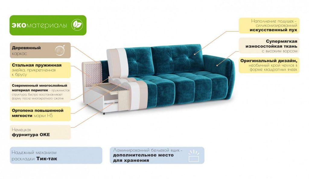 Сиденье: Пружинная ""змейка"" (из стали прикрепленная к фанере: выдерживает большие нагрузки, придает дивану упругость и ортопедичность, высокий уровень естественной вентиляции)