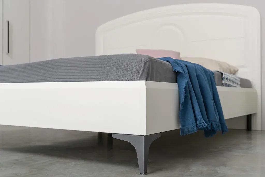 Валенсия - Лёгкая спальня в белом цвете, с фурнитурой из металла с лицевой стороны, высокие ножки, ажурная фрезеровка, фасады из МДФ, графичное сочетание на белой спальне чёрных и хромированных деталей, подчёркивает красоту это современной спальни.
