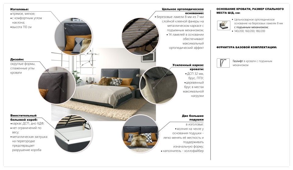 Толщина боковых стенок каркаса кровати 32мм, места максимальной нагрузки усилены деревянным брусом, внешние детали обтянуты обивкой с мягкой прослойкой - все это делает конструкцию прочной, практичной и максимально комфортной в эксплуатации. Большой бельевой короб заменит шкаф, освободит пространство спальни. Кровать Эмилия создаст атмосферу уюта и домашнего тепла.