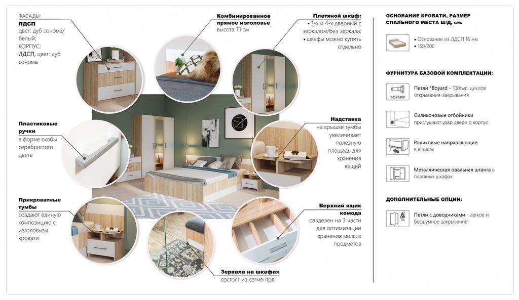 Алена - выполнена в стиле минимализм - естественные цвета, текстура дерева, простота и функциональность. В комплекте оптимальный набор функциональных модулей, который необходим для обустройства спальни: вместительный шкаф с полками и штангой, комод с ящиками, кровать с крепким и надежным основанием из ламинированной плиты и прикроватные тумбы. Кровать с двух сторон идеально дополняют идентичные по стилю прикроватные тумбы с высокой стенкой на одном уровне с изголовьем кровати - это создает визуальную целостность