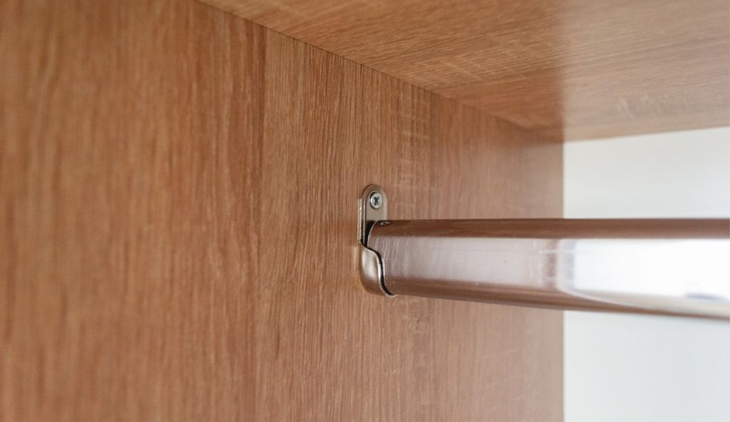 В спальне два варианта прямых шкафов с распашной конструкцией дверей, силиконовыми отбойниками, полками и металлической штангой, их можно приобрести отдельно или дополнить комплект