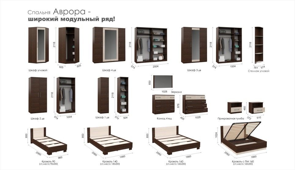 Аврора - выполнена в современном европейском стиле. Благодаря нейтральным оттенкам мебели, Вы сможете создать яркий и функциональный интерьер отражающий ваши вкусы и предпочтения. 5 вариантов шкафов с вместительными полками и качественной фурнитурой позволяют создать полноценную систему для хранения.