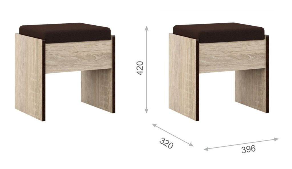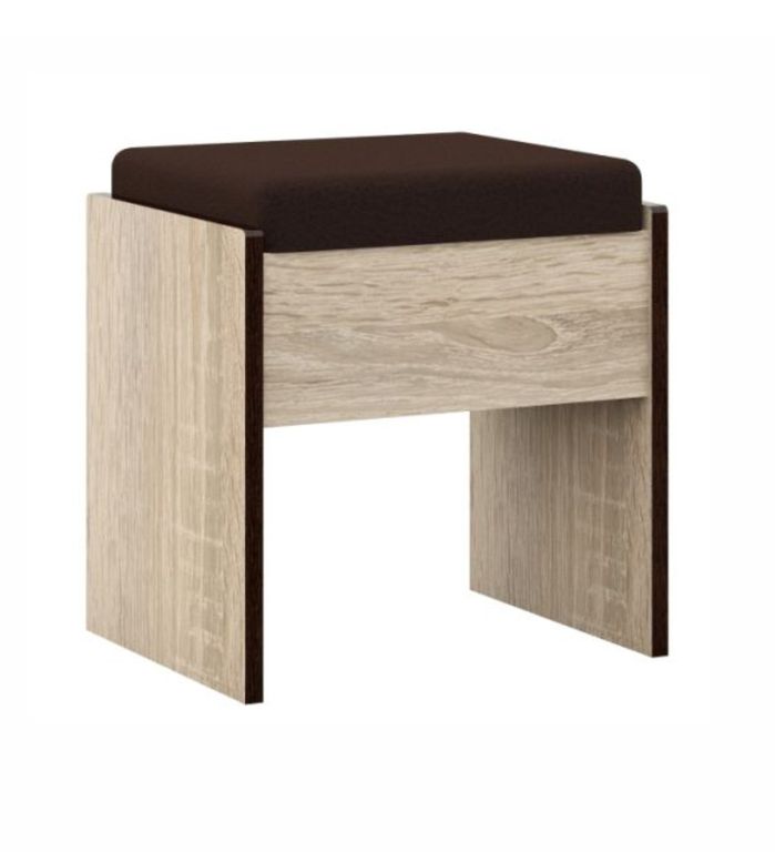 Пуф - украшение и функциональный предмет современного интерьера, который облагораживает помещение, делает его изящным и комфортабельным. Кромка цвета венге подчеркивают древесную текстуру и рисунок светлого дуба сонома, придает эффектный вид. Сиденье мягкое , обито экокожей. Идеально дополняет туалетный столик и другие модули системы Эшли.