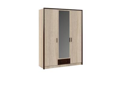 Классический распашной трехдверный шкаф с дополнительным выдвижным ящиком выполнен в стиле минимализм: строгие черты, функциональность и простота. Контрастный профиль из МДФ 22мм по внешним углам со скругленными краями – максимально безопасное использование мебели. Кромка цвета венге подчеркивает древесную текстуру и рисунок светлого дуба сонома. Зеркало на центральном фасаде делает комнату светлее и просторнее. Мебель выполнена из экологичных материалов