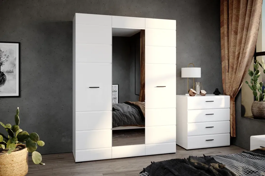 Компактный шкаф Йорк – это решение для небольшой спальни, гостиной или прихожей. Он выполнен в современном стиле – сочетает в себе функциональность и эффектный внешний вид: горизонтальная фрезеровка фасадов, контрастные черного цвета ручки и задняя стенка. Глянцевые белые фасады High Gloss из МДФ и зеркало в полный рост наполняют комнату светом, делают ее просторнее и ярче. Внутри предусмотрены секции для белья и большое отделение со штангой. Идеально компонуется со всеми модулями системы Йорк.