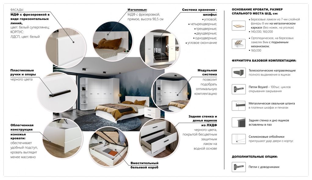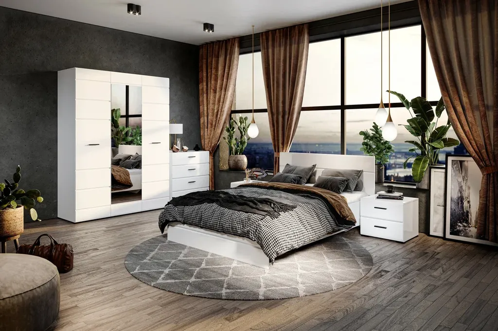 Йорк - Отличается стильным Европейским дизайном. Глянцевые белые фасады High Gloss из МДФ отражают световые потоки, спальня выглядит динамично, воздушно и легко, что актуально для небольших помещений. Разнообразие шкафов, кровати с подъёмным механизмом и с ортопедическим основанием помогут выбрать именно подходящую вам, лучшую комплектацию.