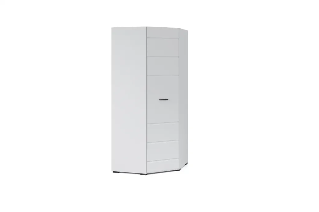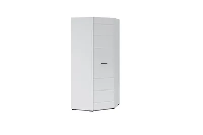 Угловой шкаф выполнен в современном стиле – сочетает в себе функциональность и эффектный внешний вид: строгая горизонтальная фрезеровка фасадов, ручки и задняя стенки контрастного черного цвета. Глянцевые белые фасады High Gloss из МДФ наполняют комнату светом, делают ее просторнее. Внутри предусмотрены секции для белья и отделение со штангой. Шкаф позволяет рационально использовать пространство и будет хорошо смотреться даже в небольшой комнате, служит связующим звеном для составления угловой системы хранения. Идеально компонуется со всеми модулями системы Йорк.