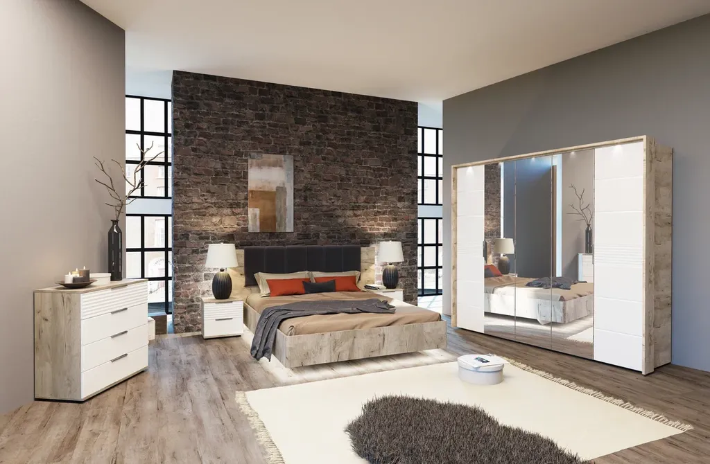 Джулия – новинка европейского рынка! Белый глянец на фрезерованных фасадах спальни отражает даже малое количество естественного света, делая ее намного уютней и светлей. Корпус из ЛДСП австрийского концерна Кроношпан с декором дуб крафт серый - цвет и текстура натурального дерева.