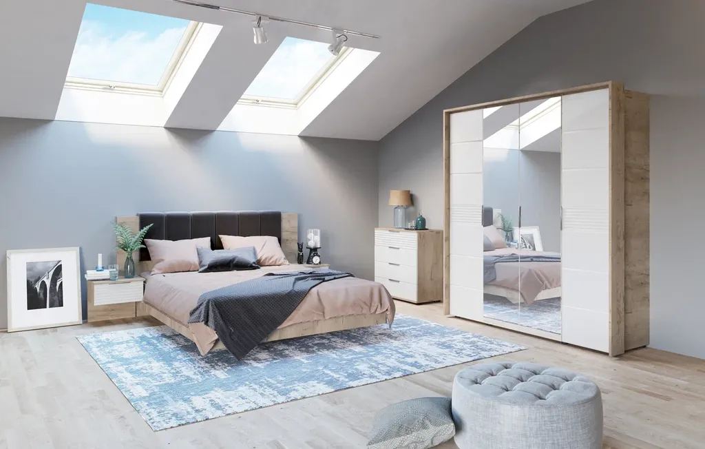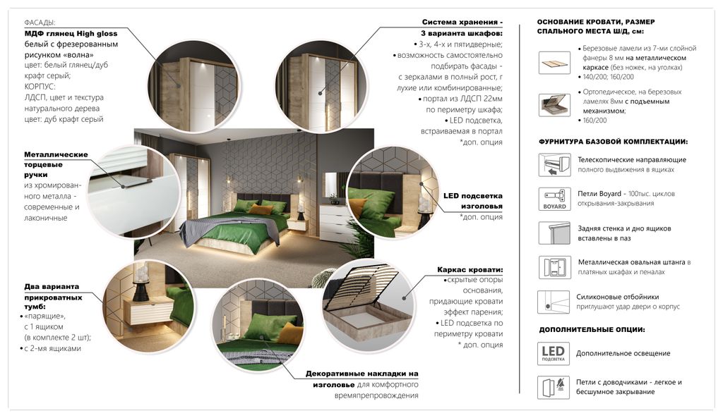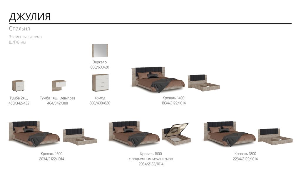 Джулия – новинка европейского рынка! Белый глянец на фрезерованных фасадах спальни отражает даже малое количество естественного света, делая ее намного уютней и светлей. Корпус из ЛДСП австрийского концерна Кроношпан с декором дуб крафт серый - цвет и текстура натурального дерева.