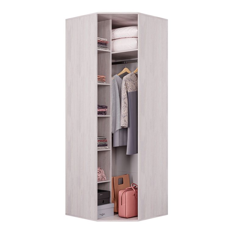 Красивая модель углового шкафа Кимберли выполнена из светлой ЛДСП цвета ясень белый.