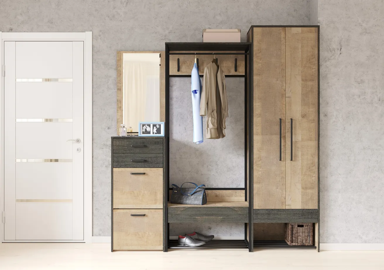 Трувор - Брутальная спальня в стиле лофт. Планкованное изголовье с изгибом. Кровать с подъёмным механизмом, который открывает доступ к вместительному коробу для хранения. Металлические опоры делают эту мебель надёжной, аутентичной и функциональной. Лицевая фурнитура с тем же покрытием придаёт мебели индустриальную эстетику. Шкаф со створкой из тонированного стекла является современным и оригинальным решением.