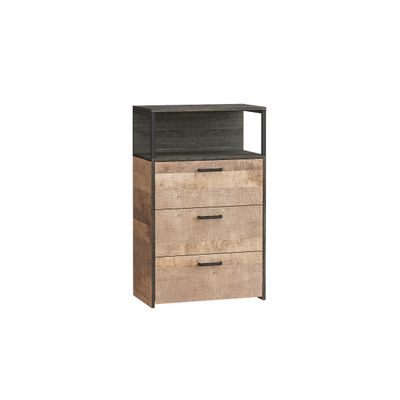 Комод оснащён закрытыми и открытыми удобными полками под вещи и декор, а также имеет вместительный ящик
