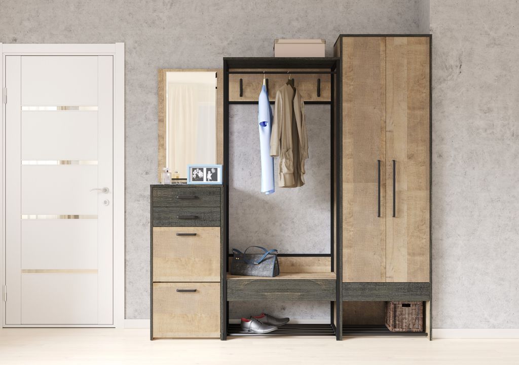 ТРУВОР - модульная прихожая, оригинальная прихожая в стиле лофт. Скрытые направляющие и четырёхшарнирные петли оснащены доводчиками, что обеспечивают повышенный комфорт и надёжность. Металлические опоры делают эту мебель надёжной, аутентичной и функциональной. Лицевая фурнитура с тем же покрытием придаёт мебели индустриальную эстетику.