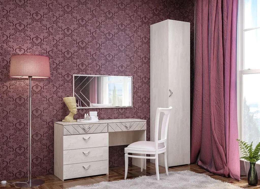 Амели - спальня в стиле ар-деко. Спокойная цветовая гамма, с имитацией фактуры шелковой ткани и камня. Фрезеровка на МДФ деталях и зеркалах.
