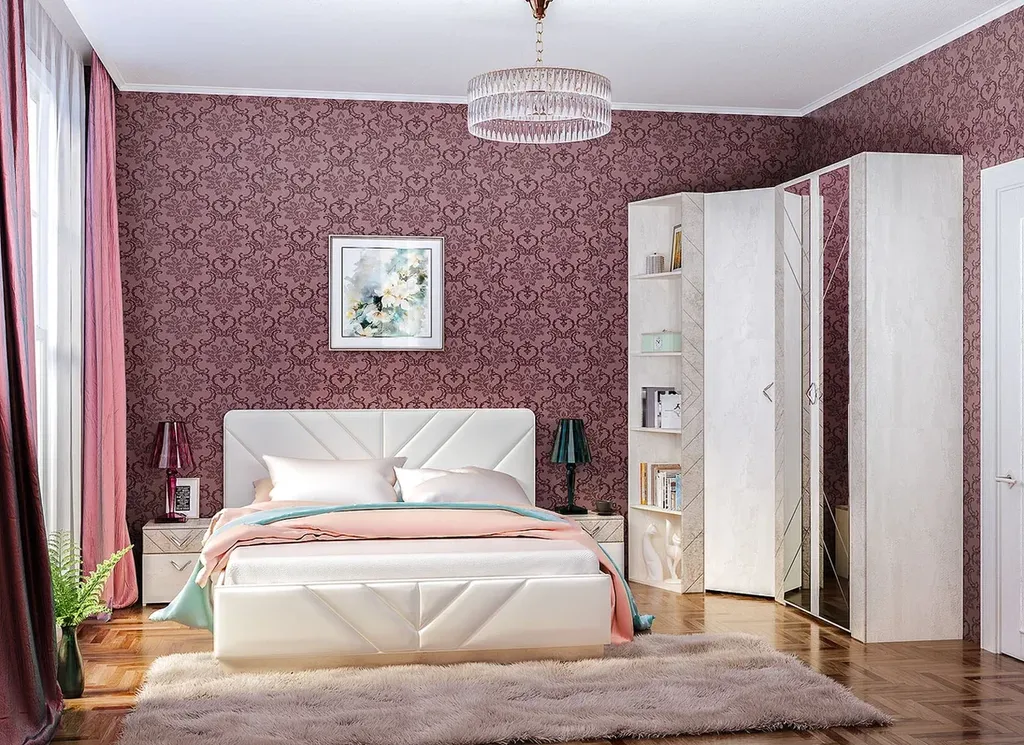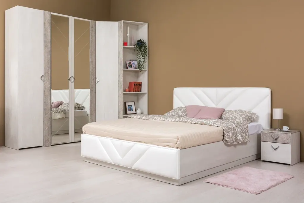 Амели - спальня в стиле ар-деко. Спокойная цветовая гамма, с имитацией фактуры шелковой ткани и камня. Фрезеровка на МДФ деталях и зеркалах.