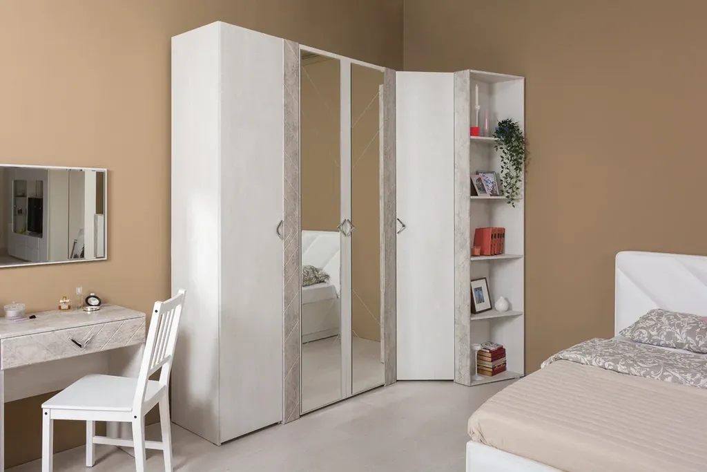 - Угловой шкаф располагает в себе удобные полочки и штангу.