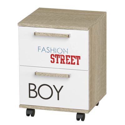 Фасады двух ящиков на шариковых направляющих – белые и украшены фотопечатью. Тумба оснащена удобными ручками и колесиками для мобильности.