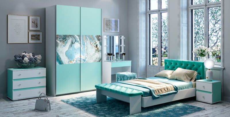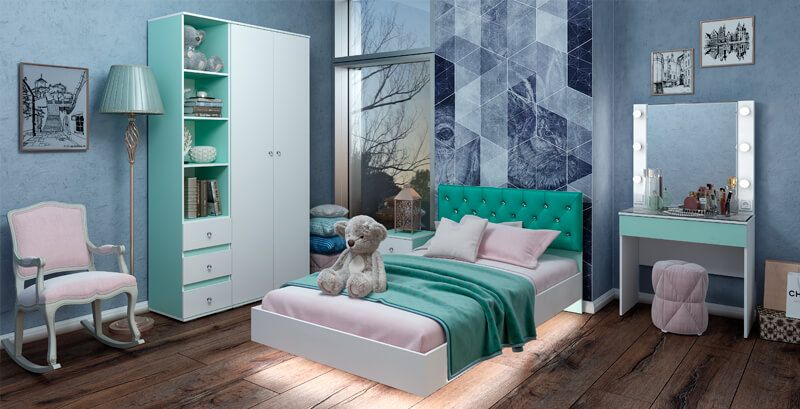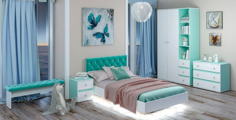 «Тифани» - стильная функциональная коллекция для современных девочек-подростков. Нежно-бирюзовые тона. Эффект парящей кровати идеально подчеркнёт использование в комплекте светодиодной ленты; Выдвижные ящики на шариковых направляющих оснащены оригинальными ручками, визуально напоминающие горный хрусталь.