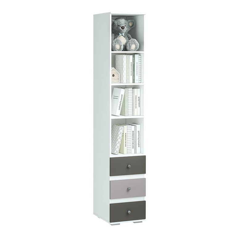 Корпус изделия выполнен из ЛДСП белого цвета, фасады трех выдвижных ящиков сделаны в комбинации цветов смоки айс и смоки кисс, украшением модели являются ручки в виде горного хрусталя. Оснащён 4 полками и 3 ящика.