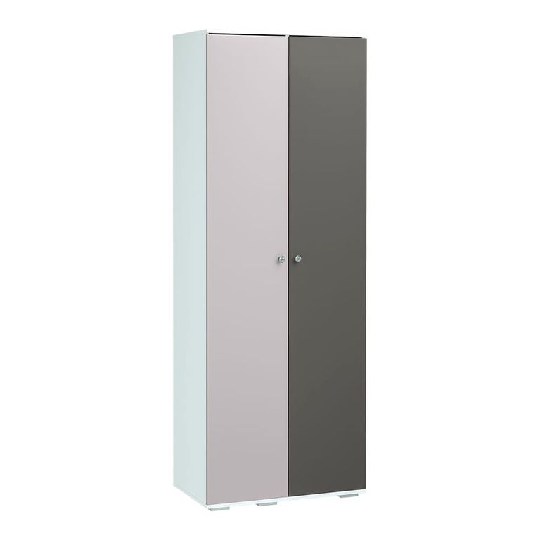 Модель из одноименной модульной серии выполнена из ЛДСП белого цвета, фасады – из МДФ в цветах смоки айс и смоки кисс, створки дополнены ручками в виде хрусталя, наполнение состоит из отделения для одежды на вешалках, а также нескольких полок.