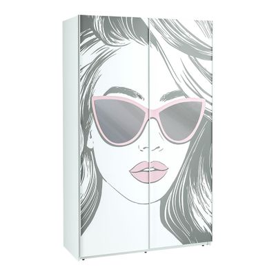 Стильная модель декорирована фотопечатью с изображением лица девушки в очках, стекла которых одновременно служат зеркалом.
