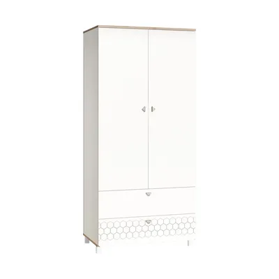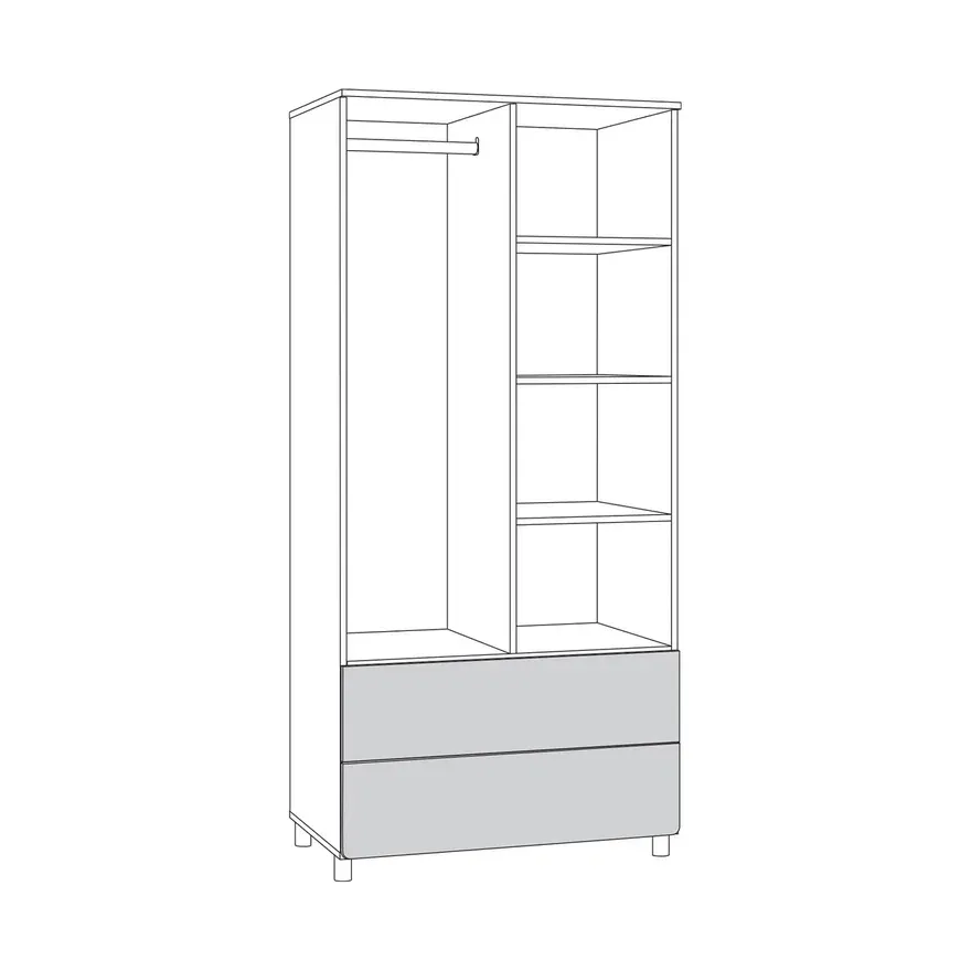 Вместительный двухдверный шкаф, оснащён с одной стороны полочками, с другой штангой. Внизу шкаф оснащён двумя дополнительными ящиками на шариковых направляющих. Собирается на обе стороны.