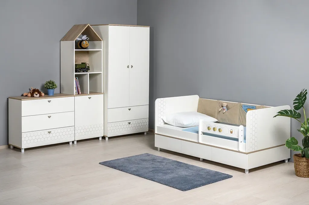Эйп - Современная и уютная мебель для детской комнаты. Скандинавские мотивы универсального цветового решения делают эту коллекцию подходящей и девочкам, и мальчикам. Все опоры - регулируемые, что позволяет легко компенсировать неровности пола. Кровать оснащена съёмным мягким элементом с карманами, передвижным бортиком и декорирована оригинальным рисунком - мультяшными пчёлками, которые никого не оставят равнодушным.