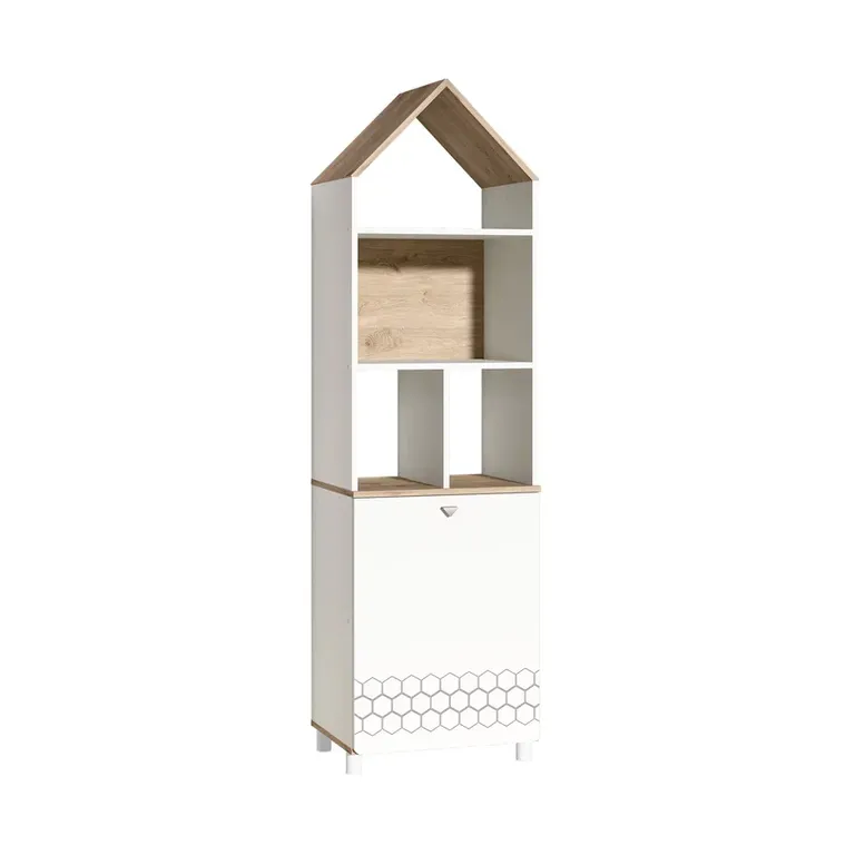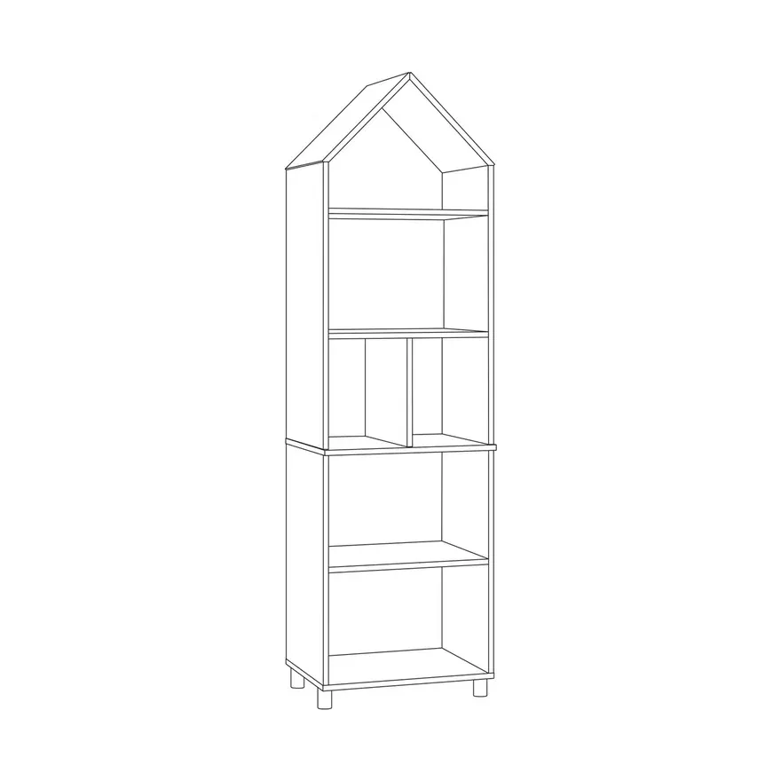 Шкаф с верхней крышей в форме домика отлично дополняет скандинавские мотивы. Оснащён глубоким, открытыми полочками, где ваш ребёнок сможет разместить свои любимые игрушки.
