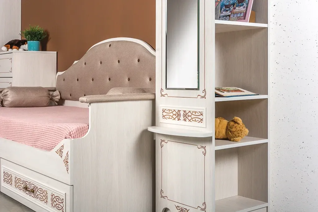 Девочкам особенно понравится стеллаж - удобная система хранения и так необходимое зеркало.