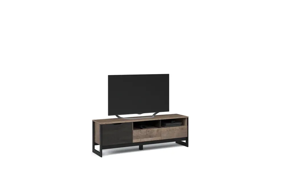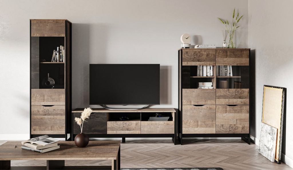 Функциональная тумба для - TV и аудио аппаратуры оснащена двумя ящиками на телескопических направляющих закрытыми и открытыми полками для хранения сопутствующих аксессуаров. Отсутствие лицевой фурнитуры подчеркивает минимализм и геометрию модуля. Особенность дизайна – это сочетание реалистичных по цвету и тактильности трендовых декоров, которые соответствуют последним городским тенденциям. «Дуб Гранж» привлекает имитацией вручную обработанного дерева и выразительной зернистой текстурой, характерной формой досок. Стильный серый цвет «Железного камня» с металлическими разводами и новая текстура состаренной штукатурки в сочетании с гладкостью металла вносят индустриальныи? колорит. Оригинальные ножки-опоры из МДФ контрастного цвета придают изюминку интерьеру.