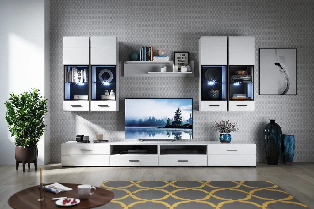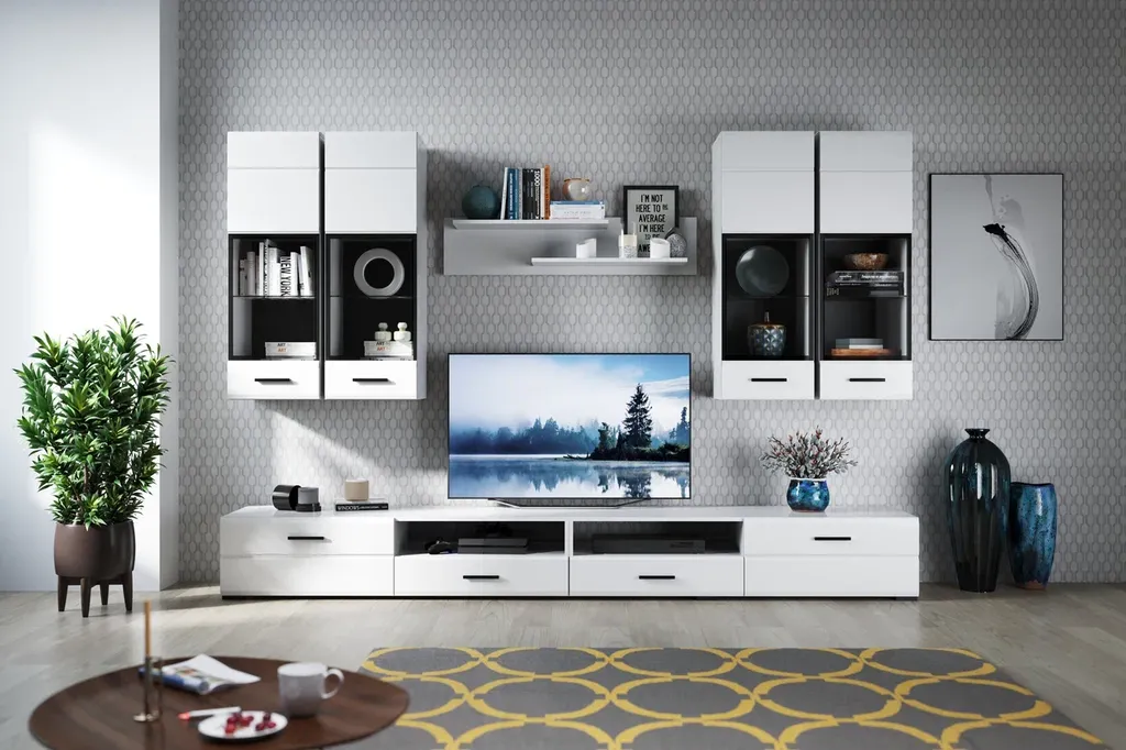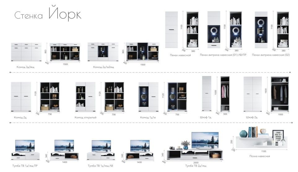Модульная система Йорк - выполнена в стиле минимализма. Строгие, лаконичные линии подчеркивают элегантность комплекта. Белый цвет мебели с деталями глубокого черного визуально сделает комнату светлее, просторнее и позволит составить безупречный по стилю комплект мебели. Сочетание глянцевой и стеклянной поверхностей, открытых полок создадут уютную обстановку и позволят украсить убранство комнаты приятными мелочами и разместить любимые книги и фото. Широкая тумба для ТВ с выдвижными ящиками на телескопических направляющих позволит удобно разместить телевизор любой диагонали.