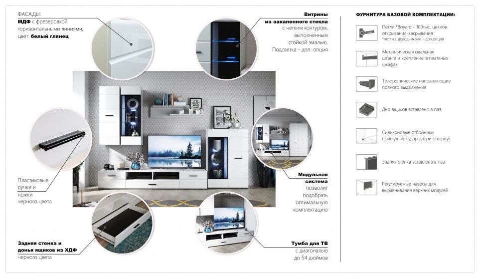 Модульная система Йорк - выполнена в стиле минимализма. Строгие, лаконичные линии подчеркивают элегантность комплекта. Белый цвет мебели с деталями глубокого черного визуально сделает комнату светлее, просторнее и позволит составить безупречный по стилю комплект мебели. Сочетание глянцевой и стеклянной поверхностей, открытых полок создадут уютную обстановку и позволят украсить убранство комнаты приятными мелочами и разместить любимые книги и фото. Широкая тумба для ТВ с выдвижными ящиками на телескопических направляющих позволит удобно разместить телевизор любой диагонали и другие медиаустройства.