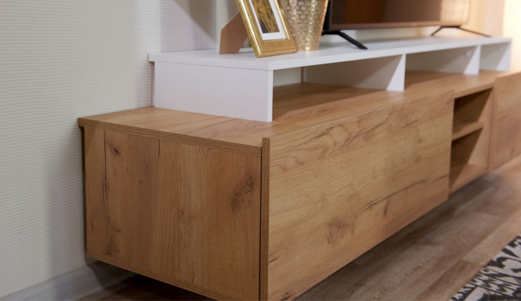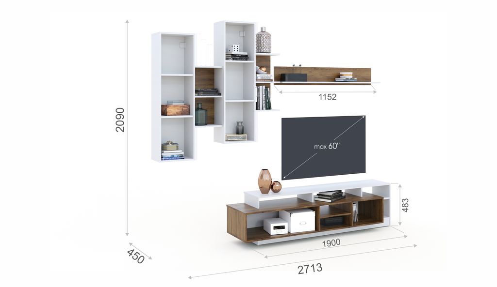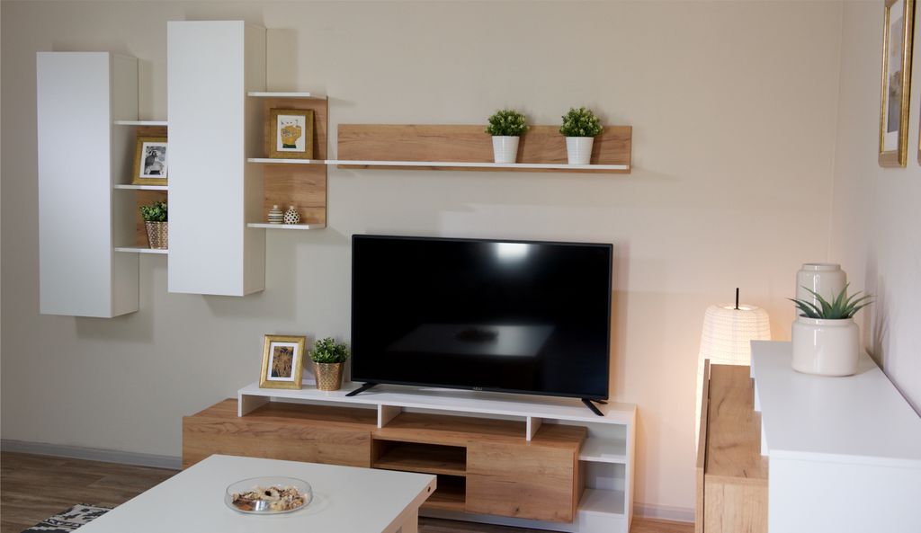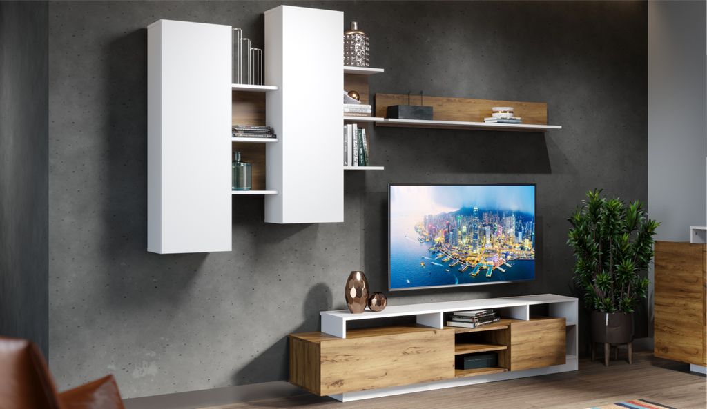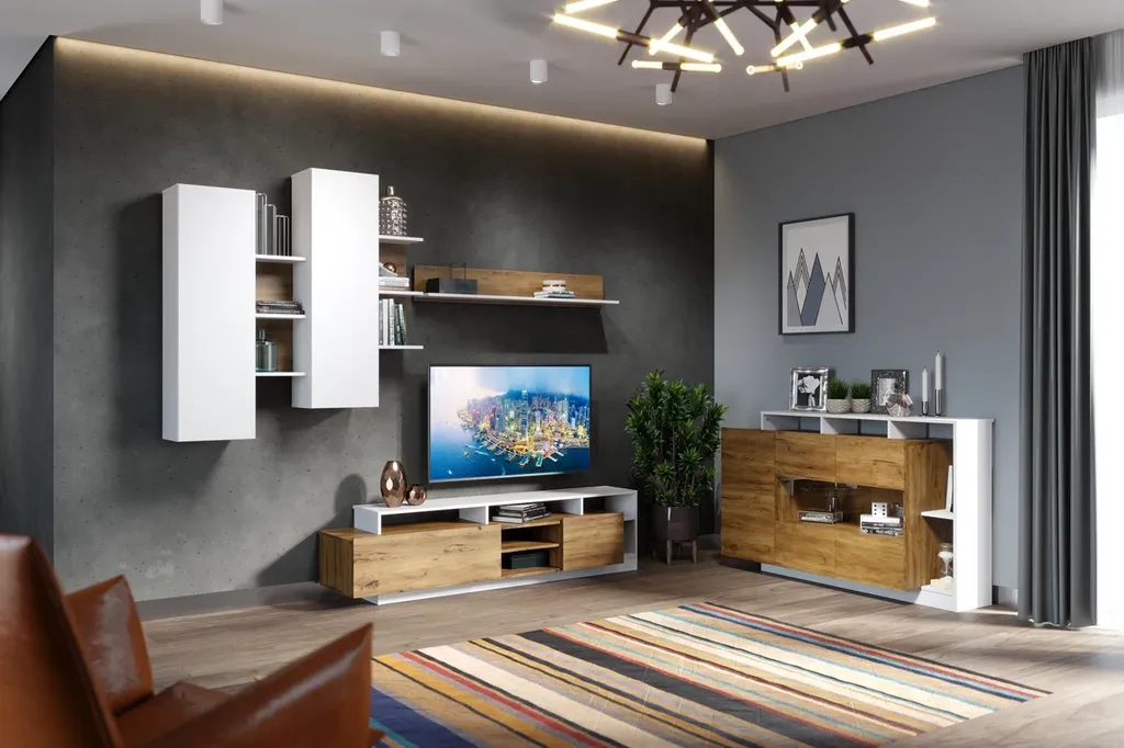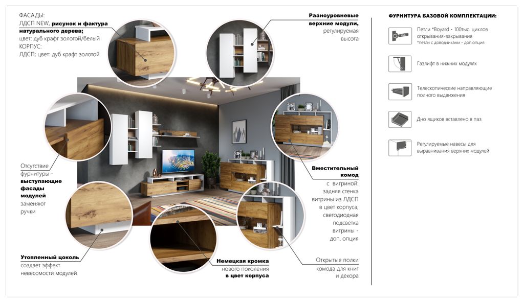 Стенка Невио-2 - выполнена с использованием новейшего декора «Дуб крафт золотой» в сочетании с белым - подходит для стилистических направлений лофт, минимализм, скандинавский. Простые формы, естественные природные оттенки создают гармоничную и умиротворенную атмосферу гостиной. Четкая текстура дерева, белый цвет, отсутствие внешней фурнитуры, углубленный цоколь - создают визуальную легкость и компактность стенки. Фасады, выступающие на 1см поверх корпуса, заменяют ручки. Стенку дополняет вместительный комод с витриной. Мебель выполнена из высококачественных экологичных материалов