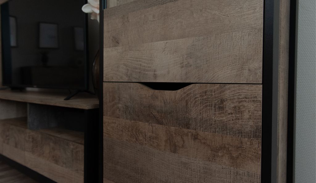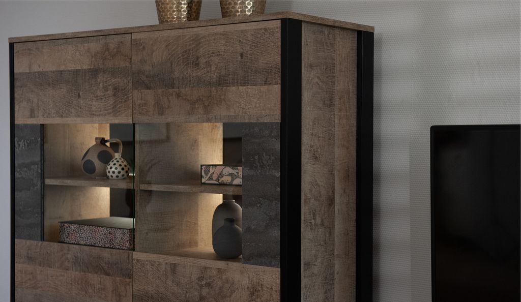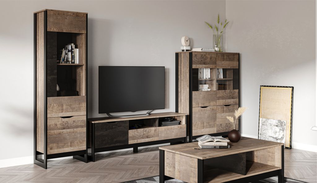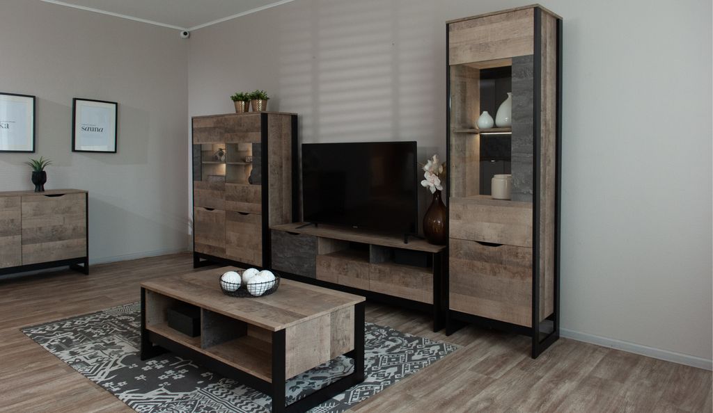 Оригинальная функциональная стенка Стокгольм - впишется в любое современное пространство гостиной в квартире или загородном доме. Особенность дизайна – это сочетание реалистичных по цвету и тактильности трендовых декоров, которые соответствуют последним городским тенденциям. «Дуб Гранж» привлекает песочным оттенком и имитацией вручную обработанного дерева с выразительной зернистой текстурой, характерной формой досок. Стильный серый цвет «Железного камня» с металлическими разводами и новая текстура состаренной штукатурки в сочетании с гладкостью металла вносят индустриальный колорит.