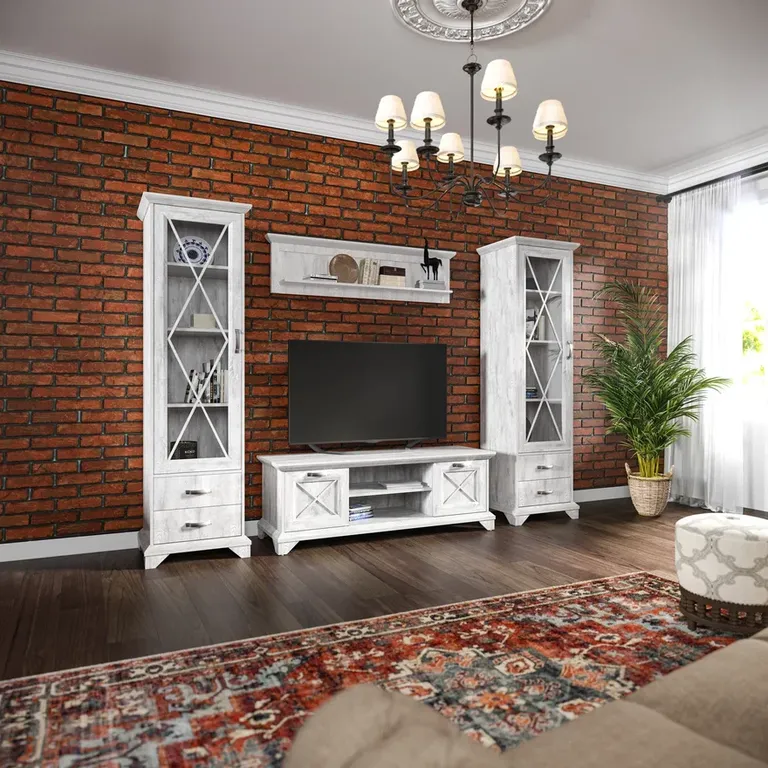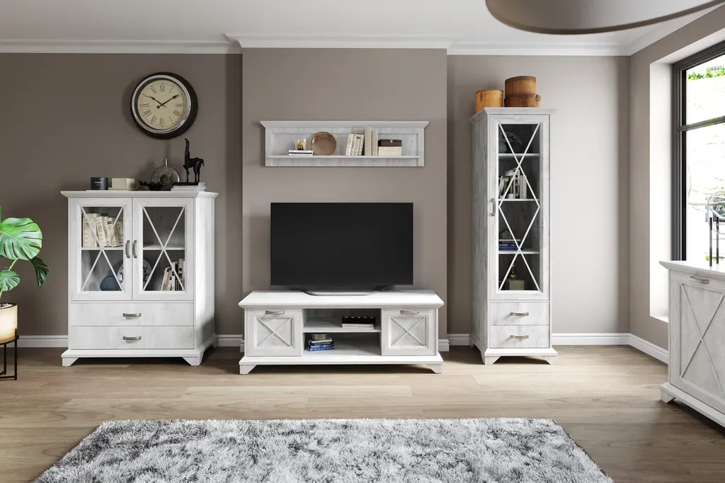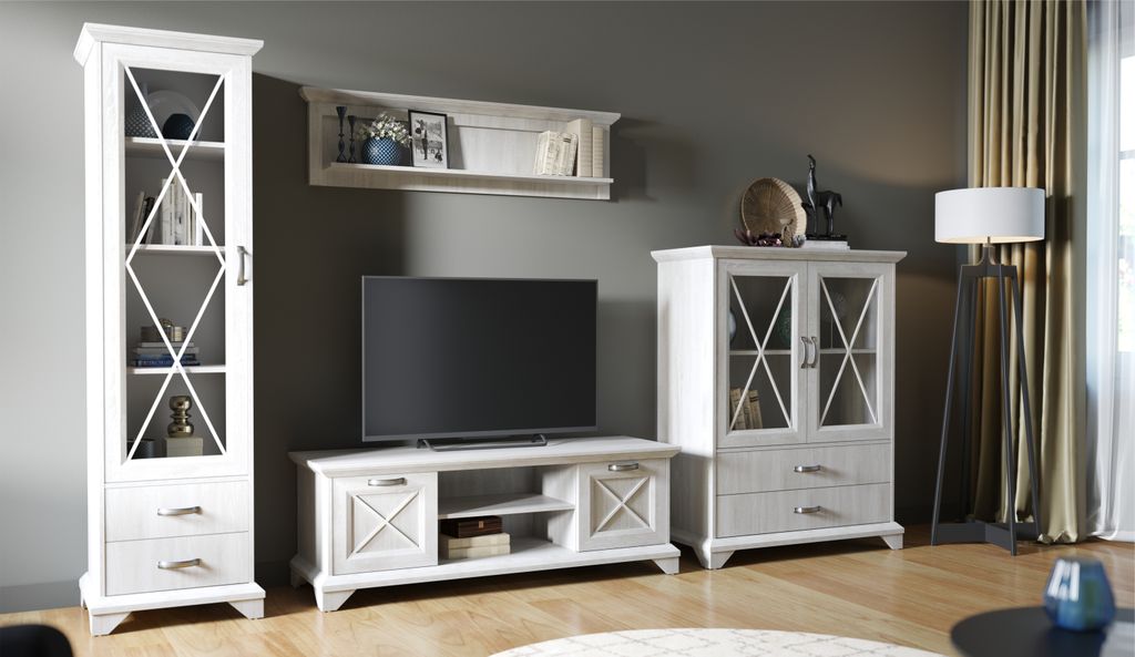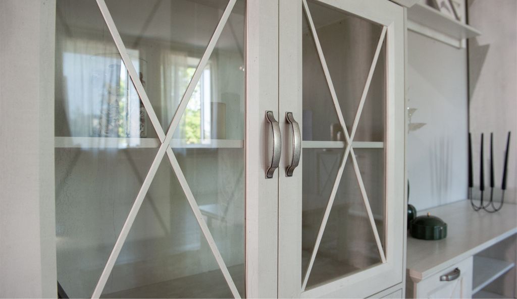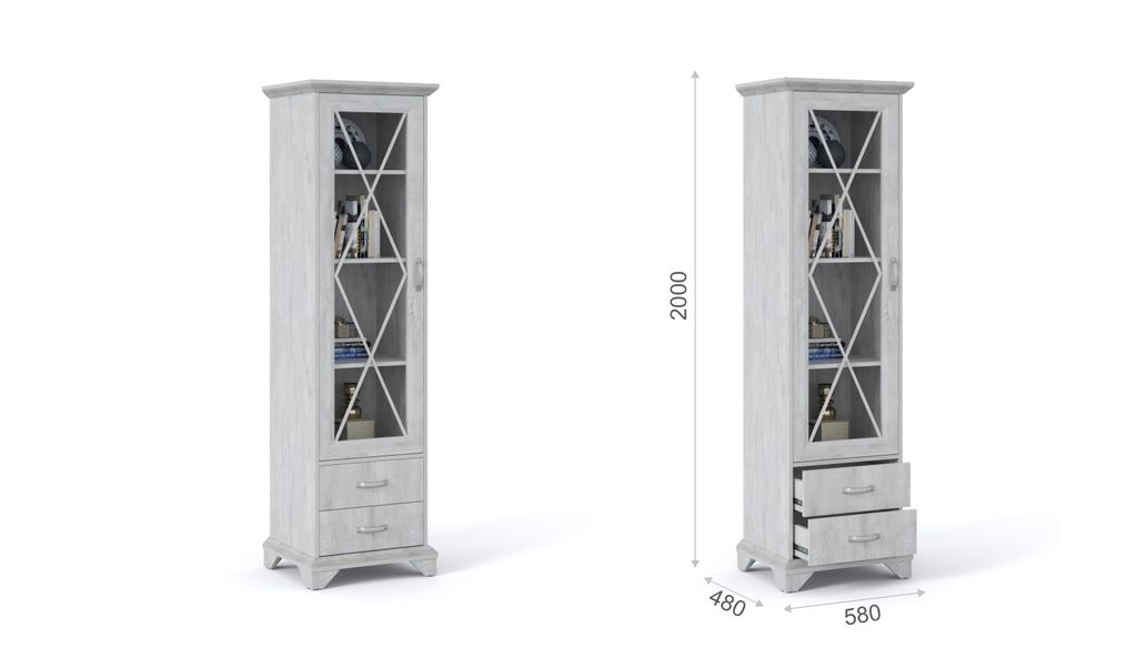Пенал-витрина Лорена 1д 2ящ - добавит уюта в интерьер гостиной в стилях неоклассика или прованс. Белые рамочные фасады с фактурой и рисунком натурального дерева, декоративные крестообразные накладки, фигурные ножки и карниз все это придает комнате элегантный и светлый вид. За прозрачным фасадом можно расположить предметы декора, красивый сервиз или книги. Выдвижные ящики на телескопических направляющих предназначены для хранения различных вещей