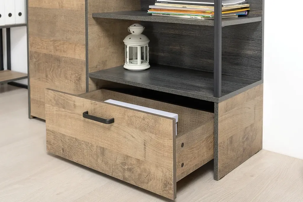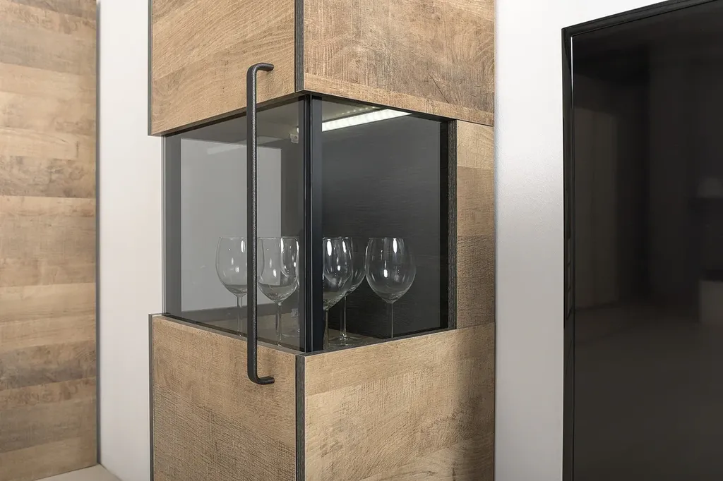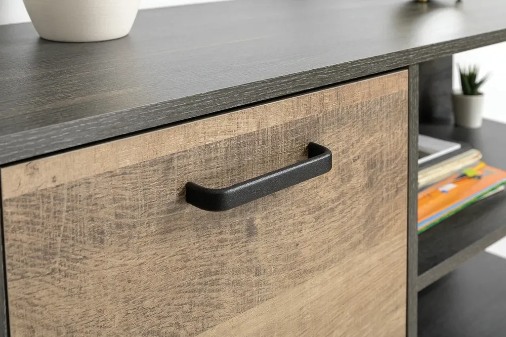 Лицевая фурнитура с тем же покрытием придаёт мебели индустриальную эстетику.