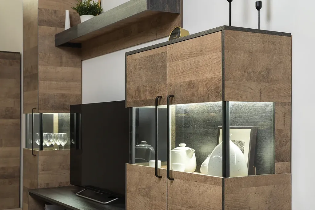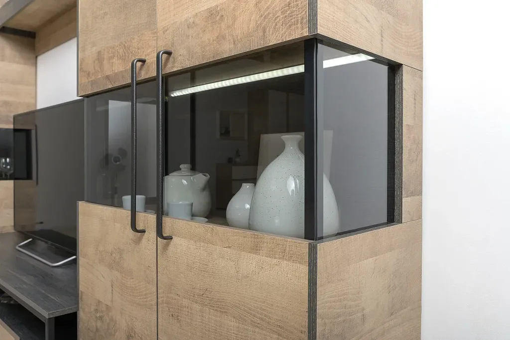 Все петли и направляющие оснащены доводчиками. Светодиодная подсветка в витринах с тонированным стеклом — эффектно подчёркивает аксессуары.