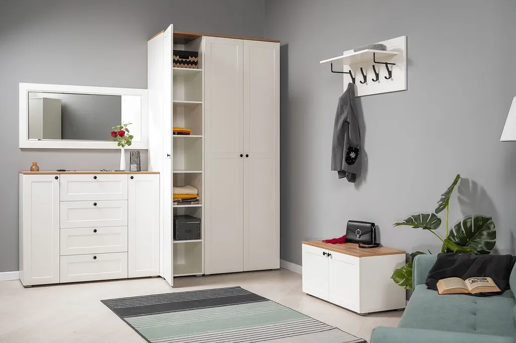 Прихожая доступна в цвете белый в сочетании с теплым древесным декором.