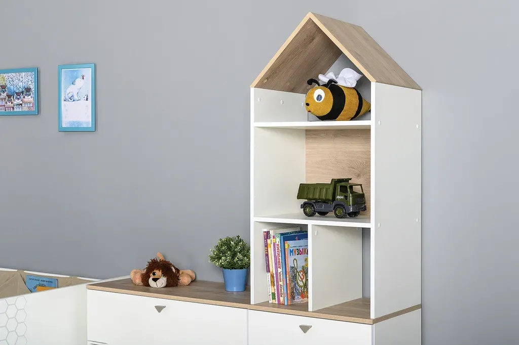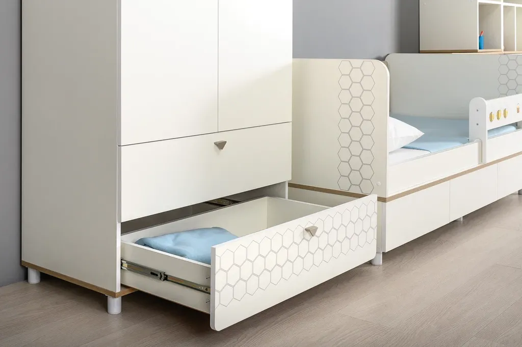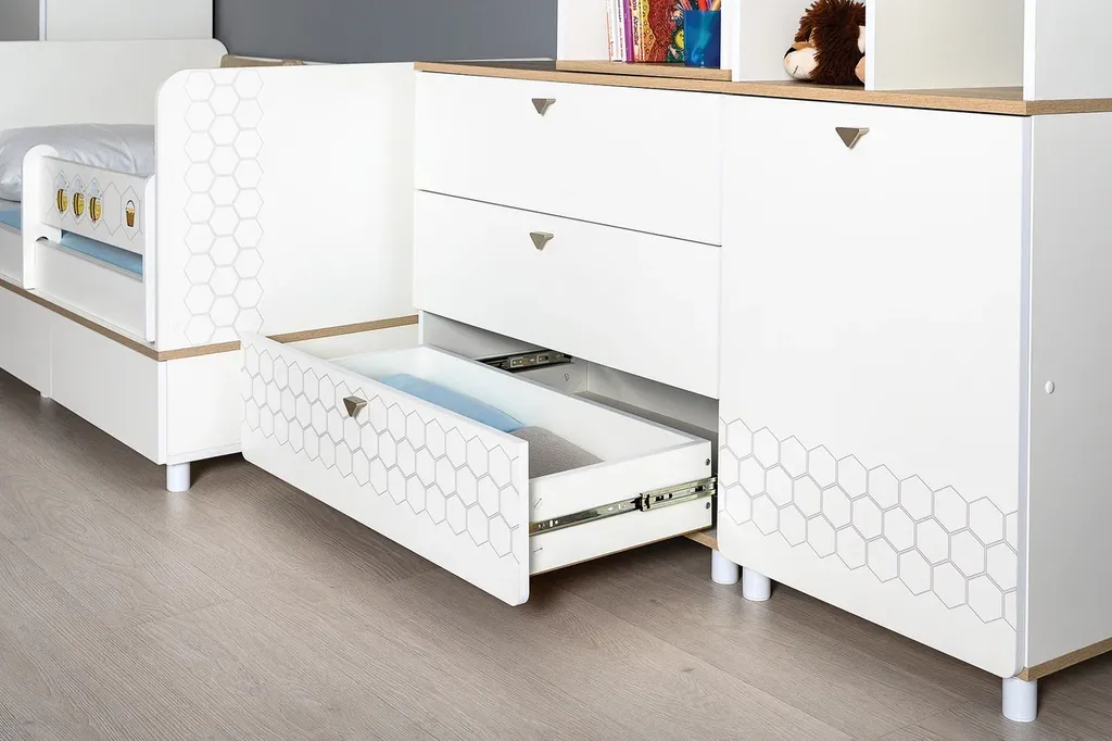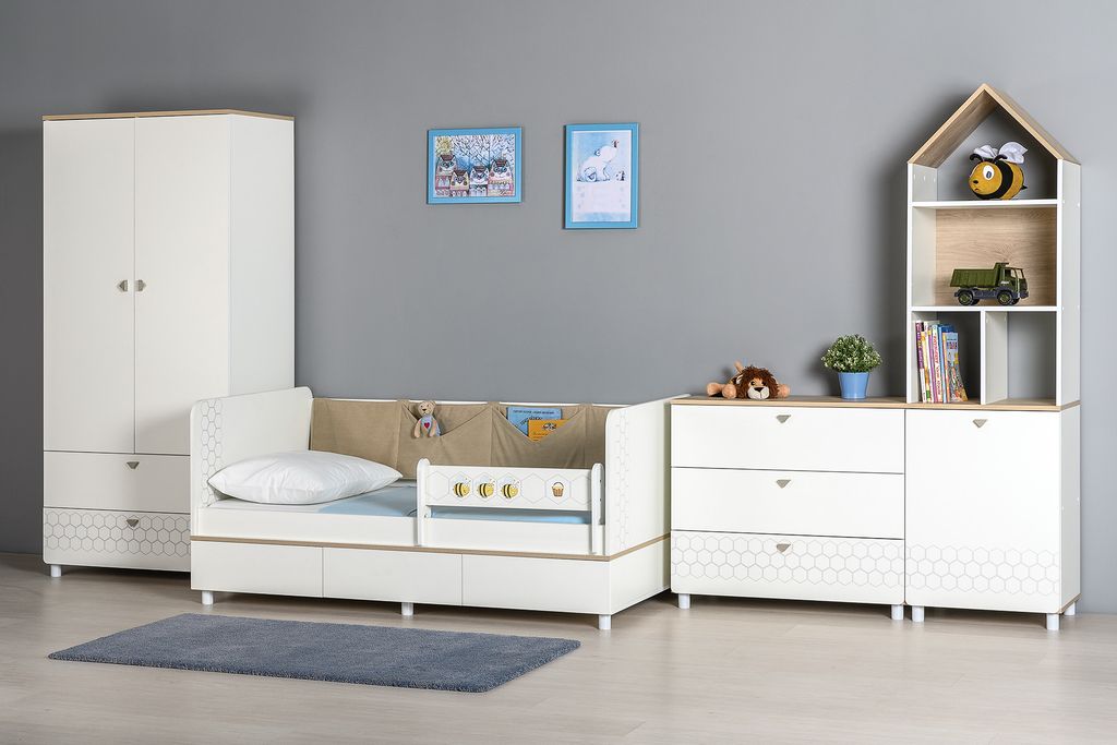 Эйп - Современная и уютная мебель для детской комнаты. Скандинавские мотивы универсального цветового решения делают эту коллекцию подходящей и девочкам, и мальчикам. Все опоры - регулируемые, что позволяет легко компенсировать неровности пола. Кровать оснащена съёмным мягким элементом с карманами, передвижным бортиком и декорирована оригинальным рисунком - мультяшными пчёлками, которые никого не оставят равнодушным.