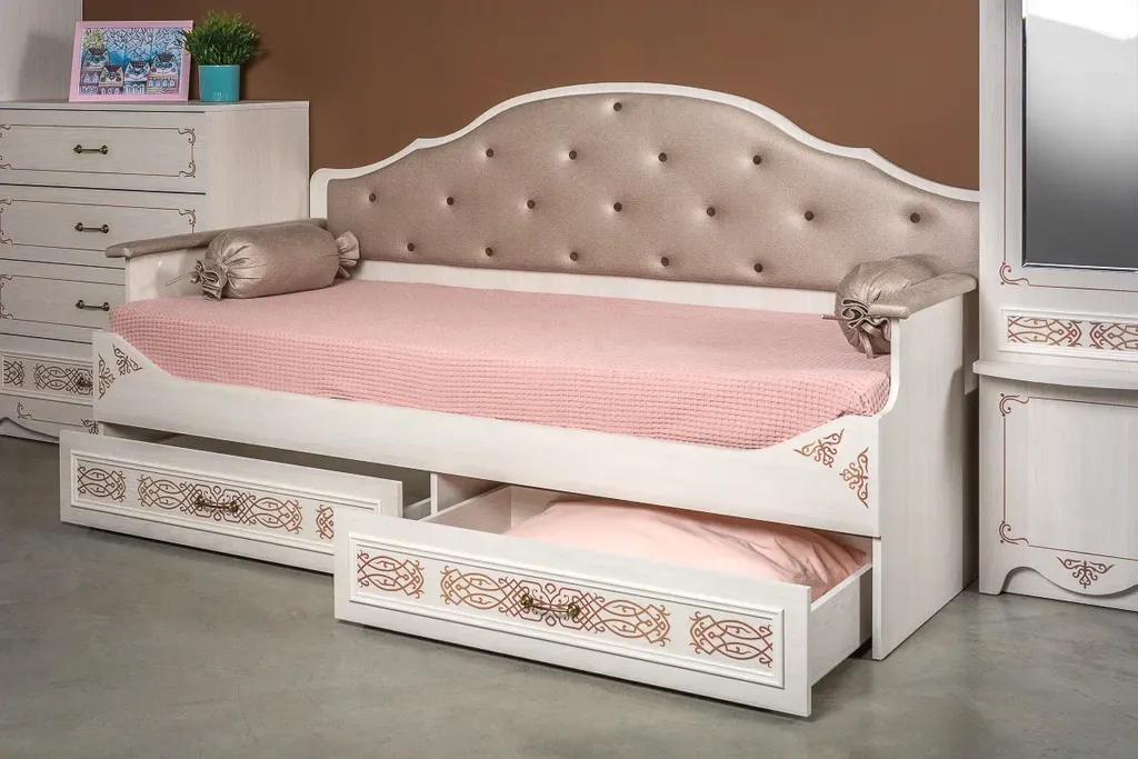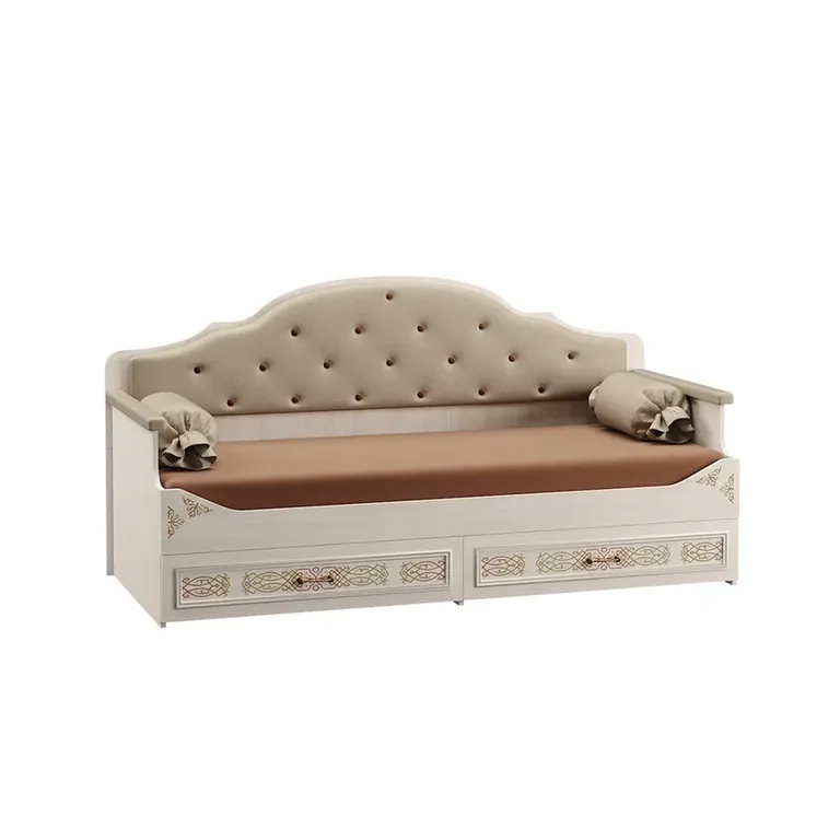 Кровать-топчан Флоренция оснащена мягким изголовьем, двумя большими выкатными ящиками. Мягкими накладками на подлокотниках и двумя подушками в виде валиков