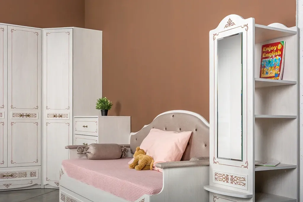 Девочкам особенно понравится стеллаж - удобная система хранения и так необходимое зеркало.