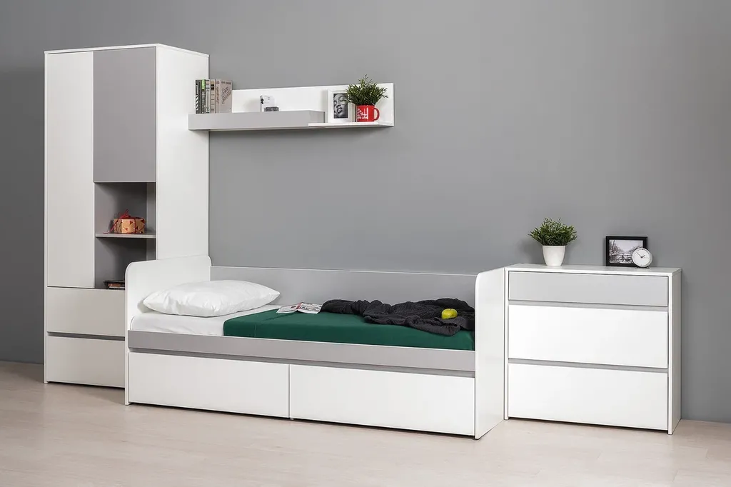 Торонто - Стильная и актуальная мебель для молодёжной комнаты. Базовый белый цвет, сочетаясь с акцентным серым, создаёт нейтральную основу интерьера, чтобы подчеркнуть личные вещи и аксессуары. Отсутствие лицевой фурнитуры и открывание фасадов за край - не только стилевое, но функциональное решение. Так мебель занимает меньше места и дает возможность проходить вплотную с фасадом без риска зацепиться за ручку или травмироваться.