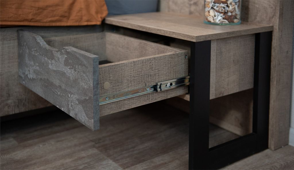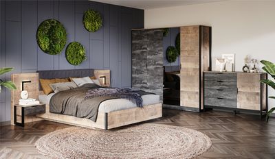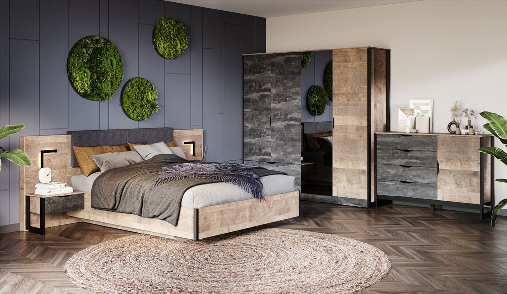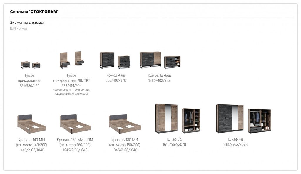Спальня «Стокгольм» – это современная функциональная система, которая станет главным украшением лофтового интерьера. Особенность дизайна – это сочетание реалистичных по цвету и тактильности трендовых декоров, которые соответствуют последним городским тенденциям. «Дуб Гранж» привлекает имитацией вручную обработанного дерева с выразительной зернистой текстурой, характерной формой досок. Стильный серый цвет «Железного камня» с металлическими разводами и новая текстура состаренной штукатурки в сочетании с гладкостью металла вносят индустриальныи колорит